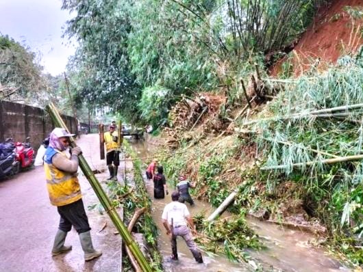 Penanganan difokuskan pada pembersihan material longsor dan pemotongan batang bambu yang melintang di dalam saluran.