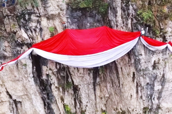 Bentangan kain merah-putih itu menjuntai gagah dari tebing setinggi 100 meter.