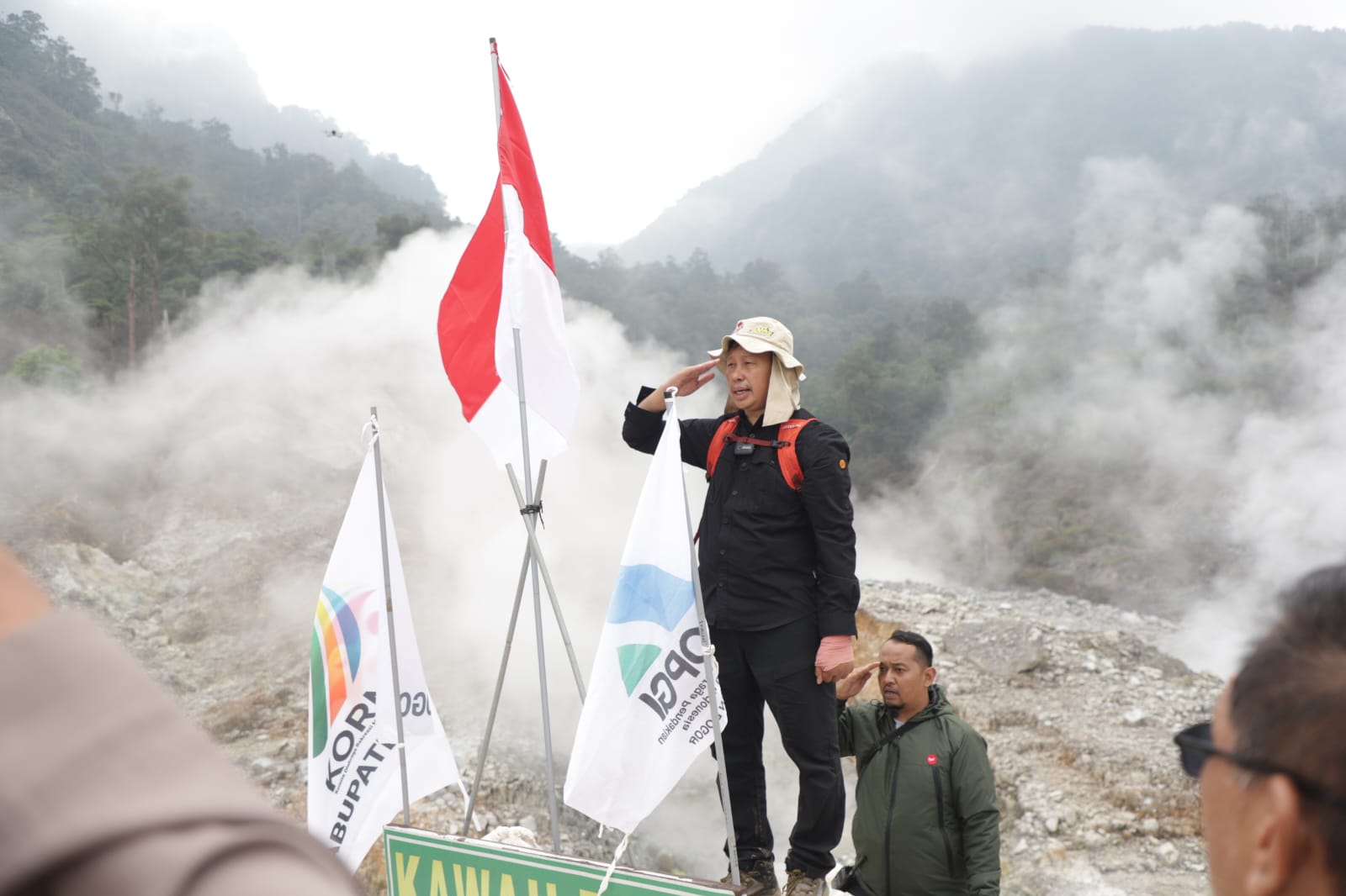 Pj Bupati Bogor, Asmawa Tosepu saat mengibarkan bendera merah putih di Kawah Ratu, Taman Nasional Gunung Halimun Salak. Foto: Pemkab Bogor